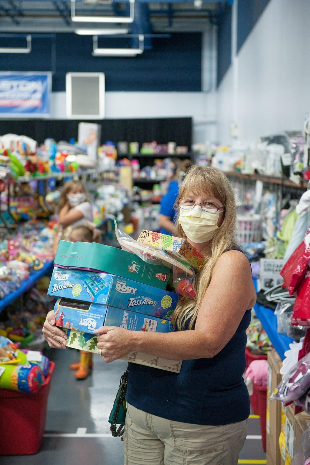 A mom and grandmother stand beside a rack of clothing at a JBF sale in Texas.